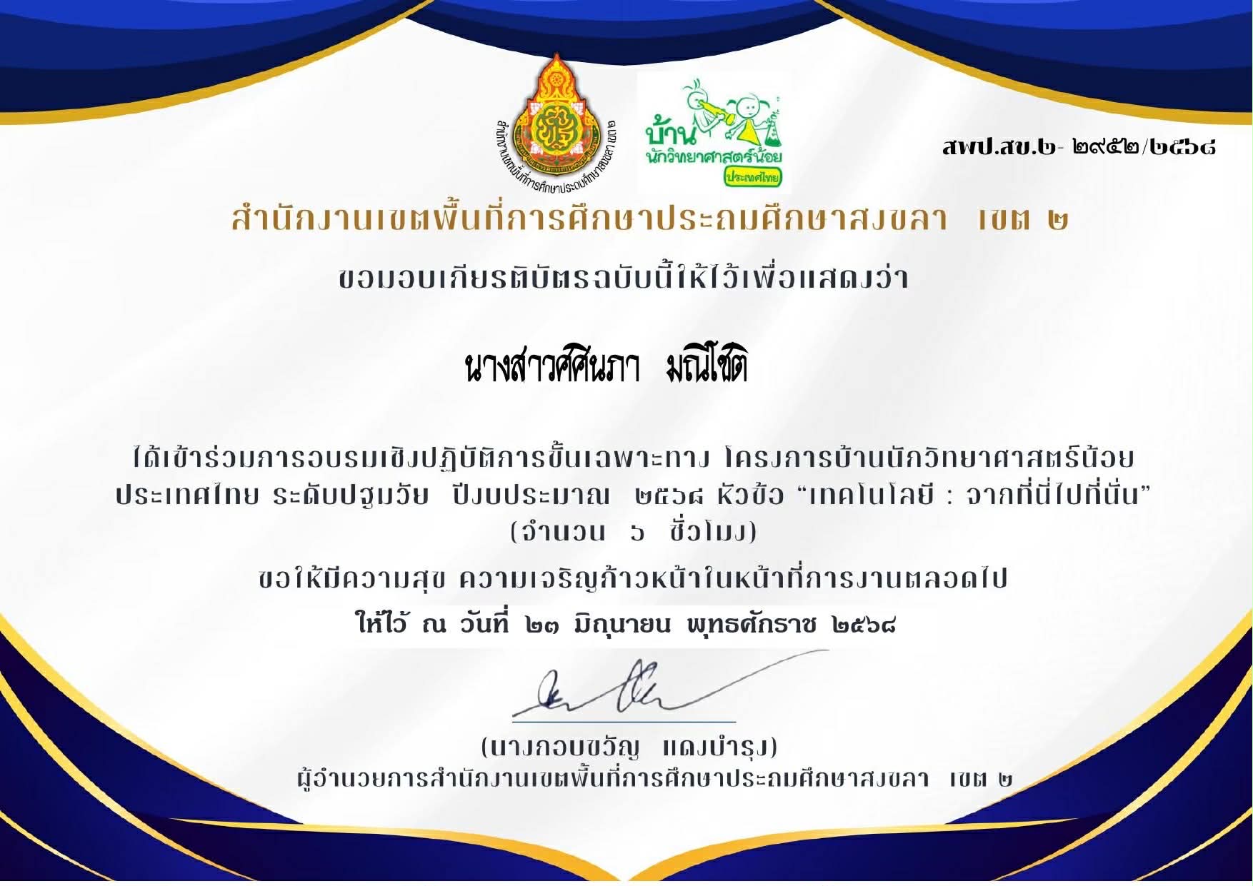 ชื่อผลงาน : ได้เข้าร่วมการอบรมเชิงปฏิบัติการขั้นเฉาะทาง โครงการบ้านนักวิทยาศาสตร์น้อยประเทศไทย ระดับปฐมวัย ปีงบประมาณ 2568 หัวข้อ"เทคโนโลยี:จากที่นี่ไปที่นั่น"(จำนวน6ชั่วโมง)