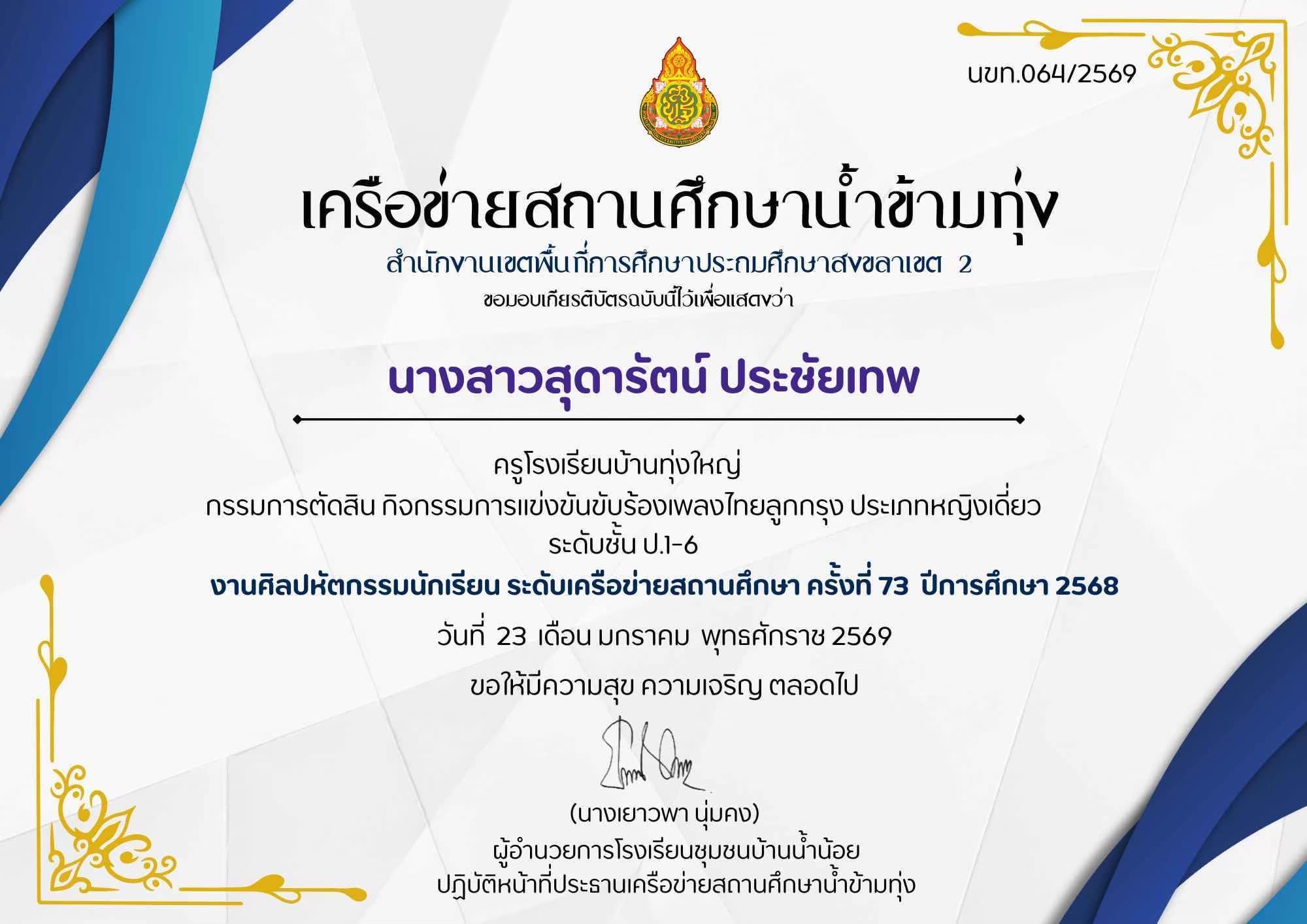 ชื่อผลงาน : กรรมการตัดสิน กิจกรรมการแข่งขันขับร้องเพลงไทยลูกรุง ประเภทหญิงเดี่ยวระดับชั้นป.1-ป.6 งานศิลปหัตถกรรมนักเรียน ระดับเครือข่ายสถานศึกษาครั้งที่ 73 ปีการศึกษา2568
