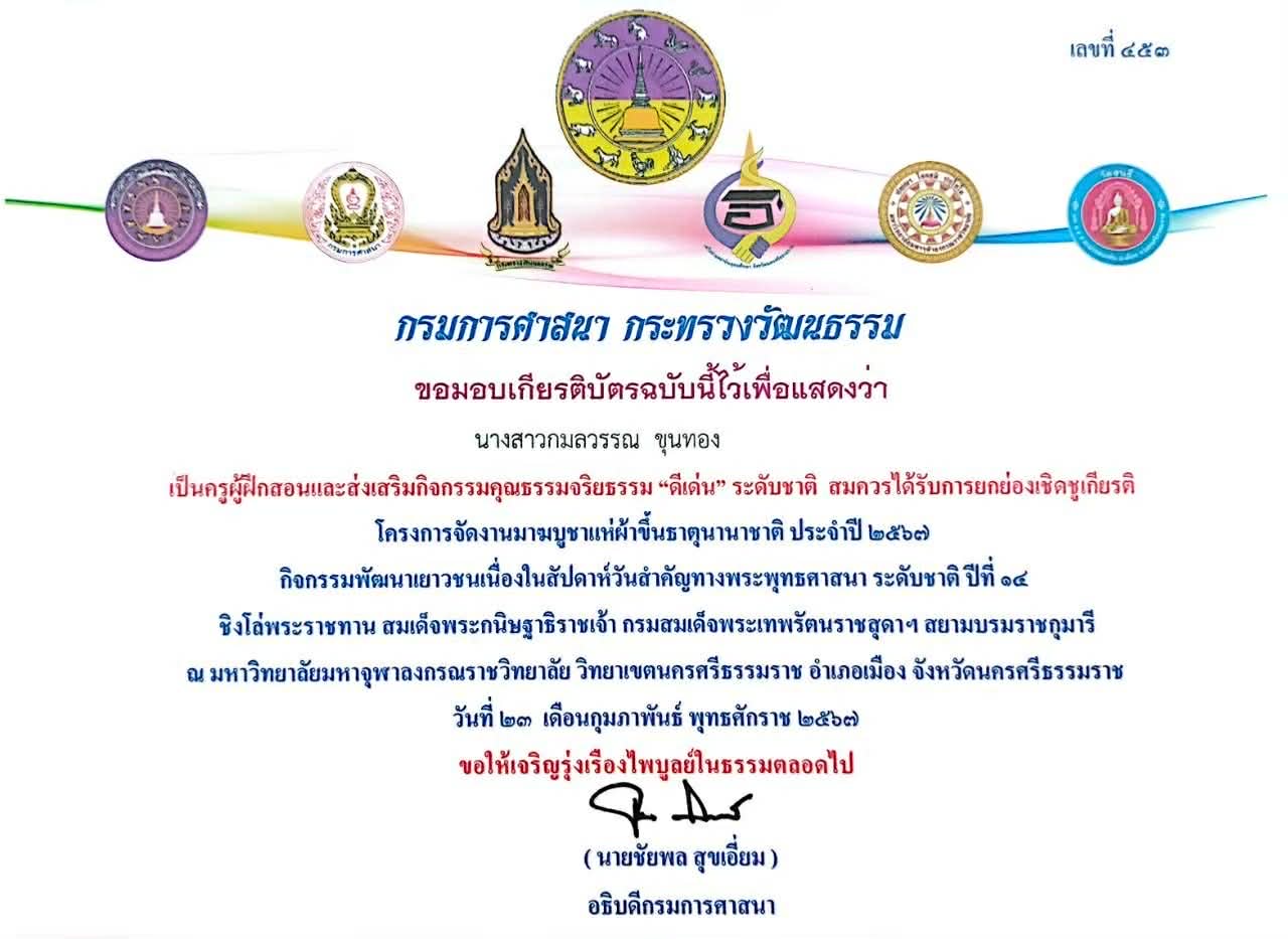 ชื่อผลงาน : ครูผู้ฝึกสอนและส่งเสริมกิจกรรมคุณธรรมจริยธรรม “ดีเด่น” ระดับชาติ : การประกวดมารยาทไทย โครงการส่งเสริมกิจกรรมพัฒนาเยาวชน เนื่องในสัปดาห์วันสำคัญทางพระพุทธศาสนา วันมาฆบูชา แห่ผ้าขึ้นธาตุ ประจำปี 2567 ระดับชาติ ครั้งที่ 14 ณ มหาวิทยาลัยมหาจุฬาลงกร์ราชวิทยาลั