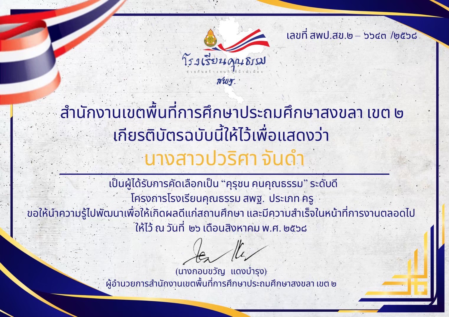 เป็นผู้ได้รับการคัดเลือกเป็น"คุรุชน คนคุณธรรม" ระดับดี โครงการคุณธรรม สพฐ. ประเภทครู