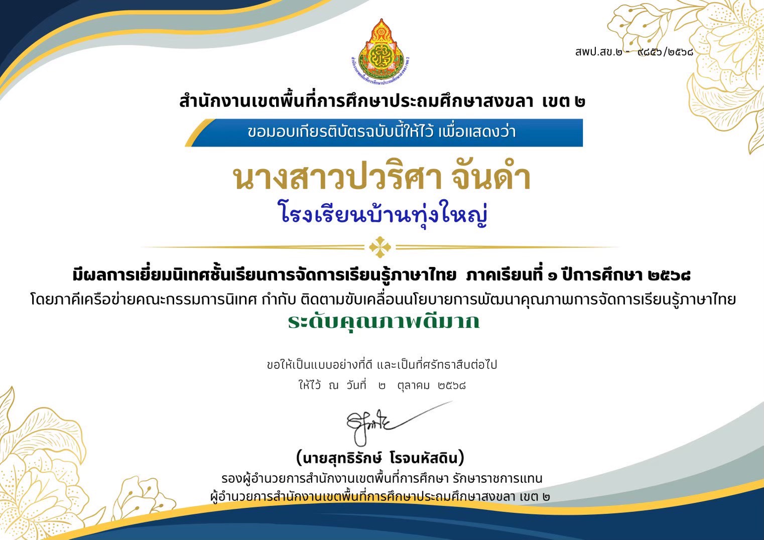 ชื่อผลงาน : มีผลการเยี่ยมนิเทศชั้นเรียนการจัดการเรียนรู้ภาษาไทย ภาคเรียนที่ 1 ปีการศึกษา 2568 "ระดับคุณภาพดีมาก"