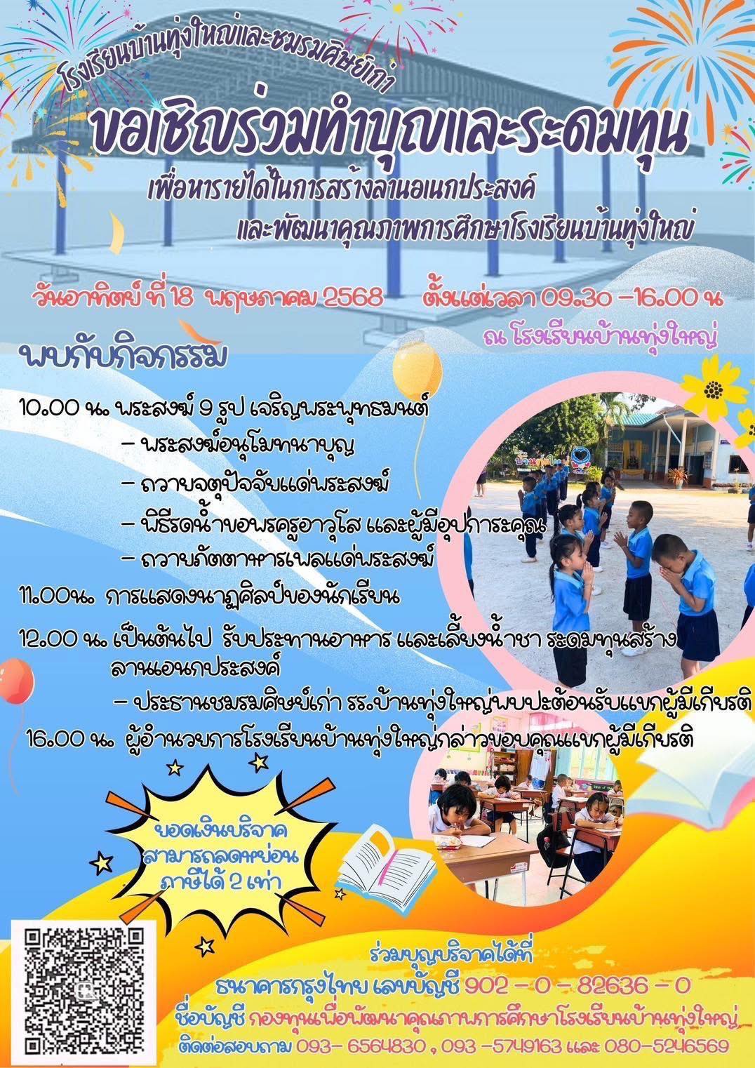 เรียนเชิญแขกผู้มีเกียรติทุกท่าน  ร่วมงาน “ทำบุญ และระดมทุน เพื่อหารายได้ในการสร้างลานเอนกประสงค์ และพัฒนาคุณภาพการศึกษาโรงเรียนบ้านทุ่งใหญ่”