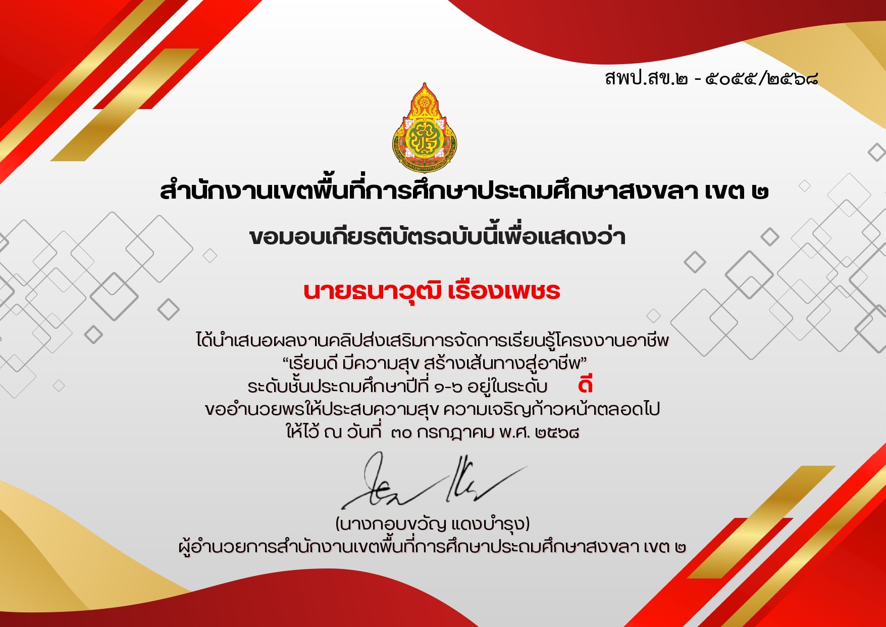 ชื่อผลงาน : นำเสนอผลงานคลิปส่งเสริมการจัดการเรียนรู้โครงงานอาชีพ "เรียนดี มีความสุข สร้างเส้นทางสู่อาชีพ" ระดับชั้นป.1-6 อยู่ในระดับ ดี