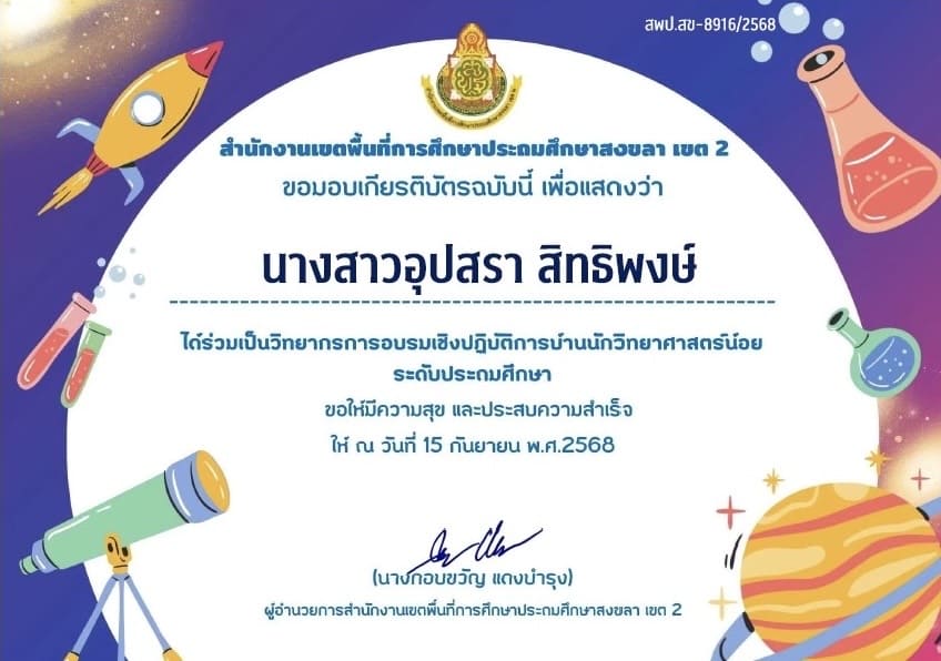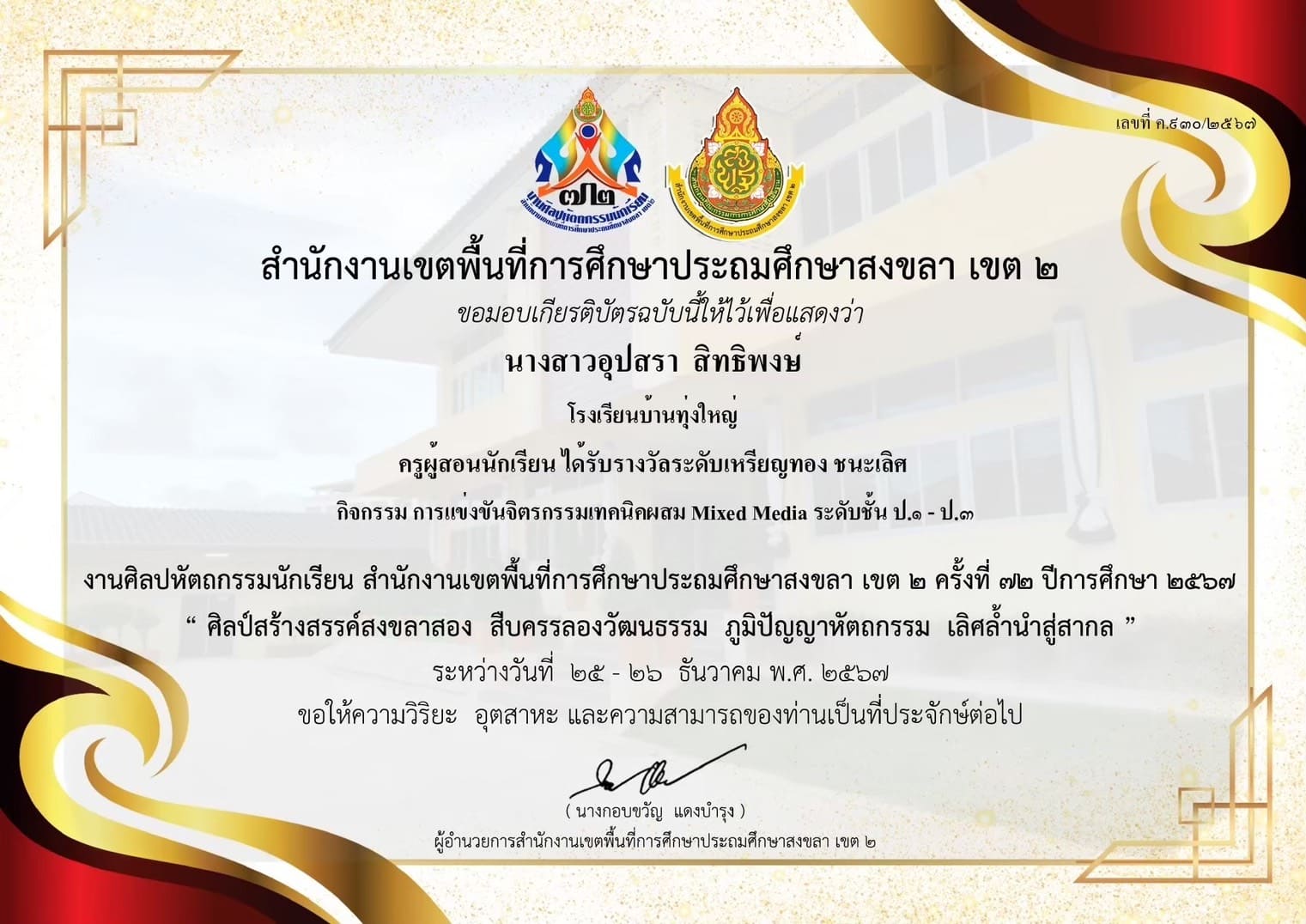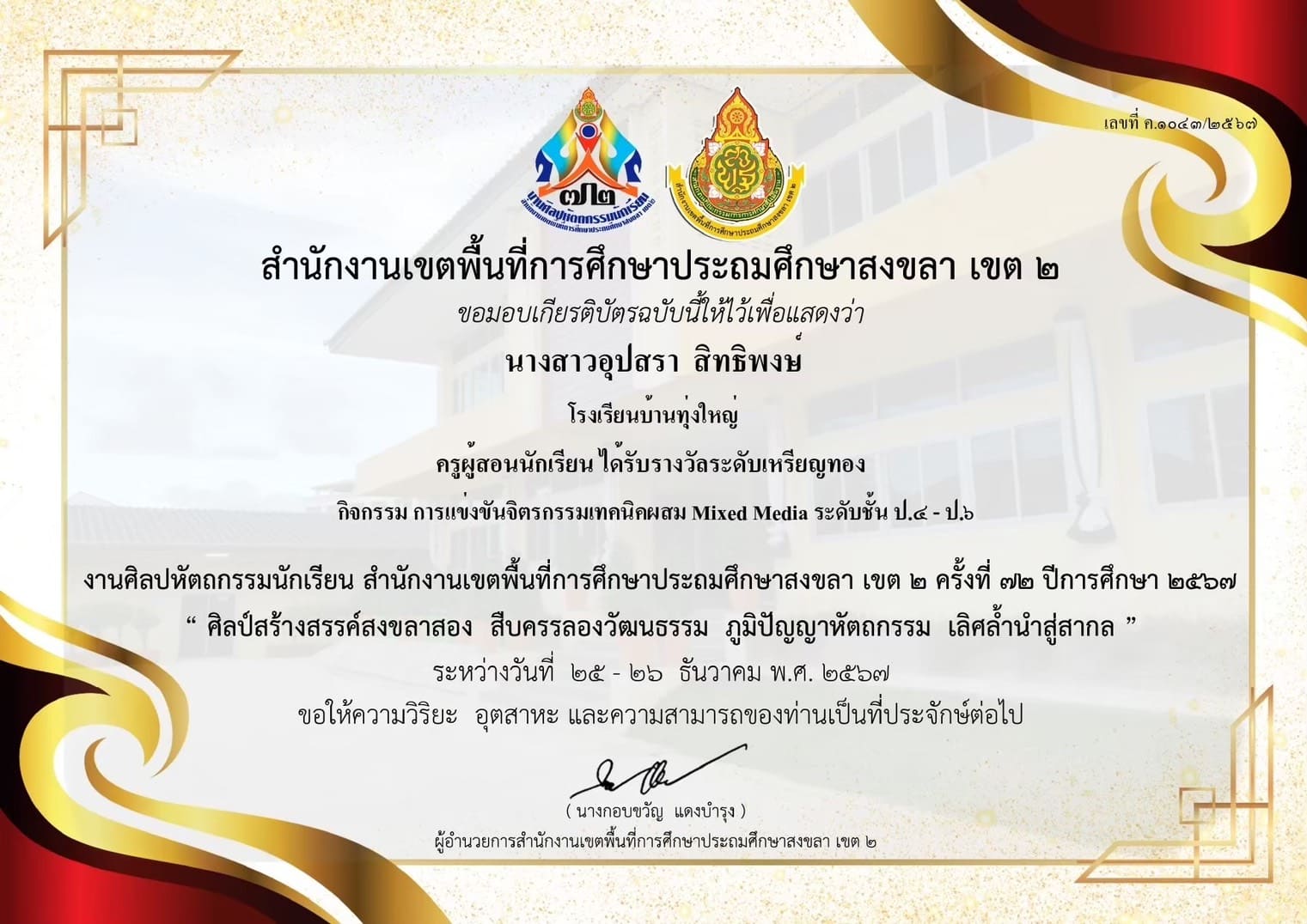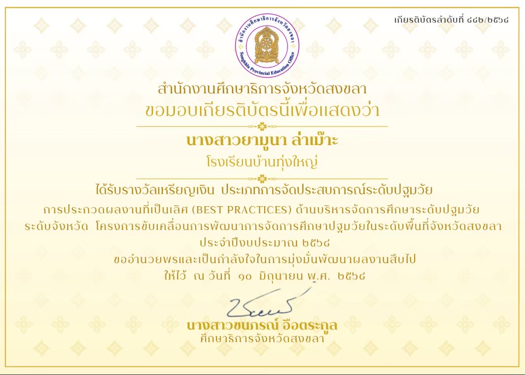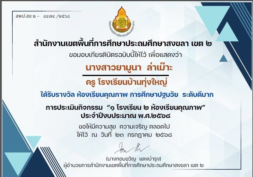 ครูผู้สอนนักเรียน ได้รับรางวัลระดับเหรียญทอง กิจกรรมการแข่งขันการวาดภาพระบายสี ประเภทนักเรียนที่มีความบกพร่องด้านการเรียนรู้ ชั้น ป.1-ป.6 งานศิลปหัตถกรรมนักเรียน สำนักงานเขตพื้นที่การศึกษาประถมศึกษาสงขลา เขต 2 |